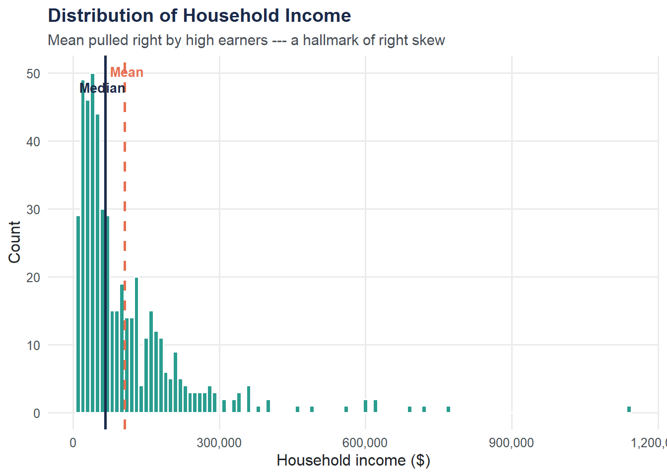 subtitle = "Mean pulled right by high earners --- a hallmark of right skew",