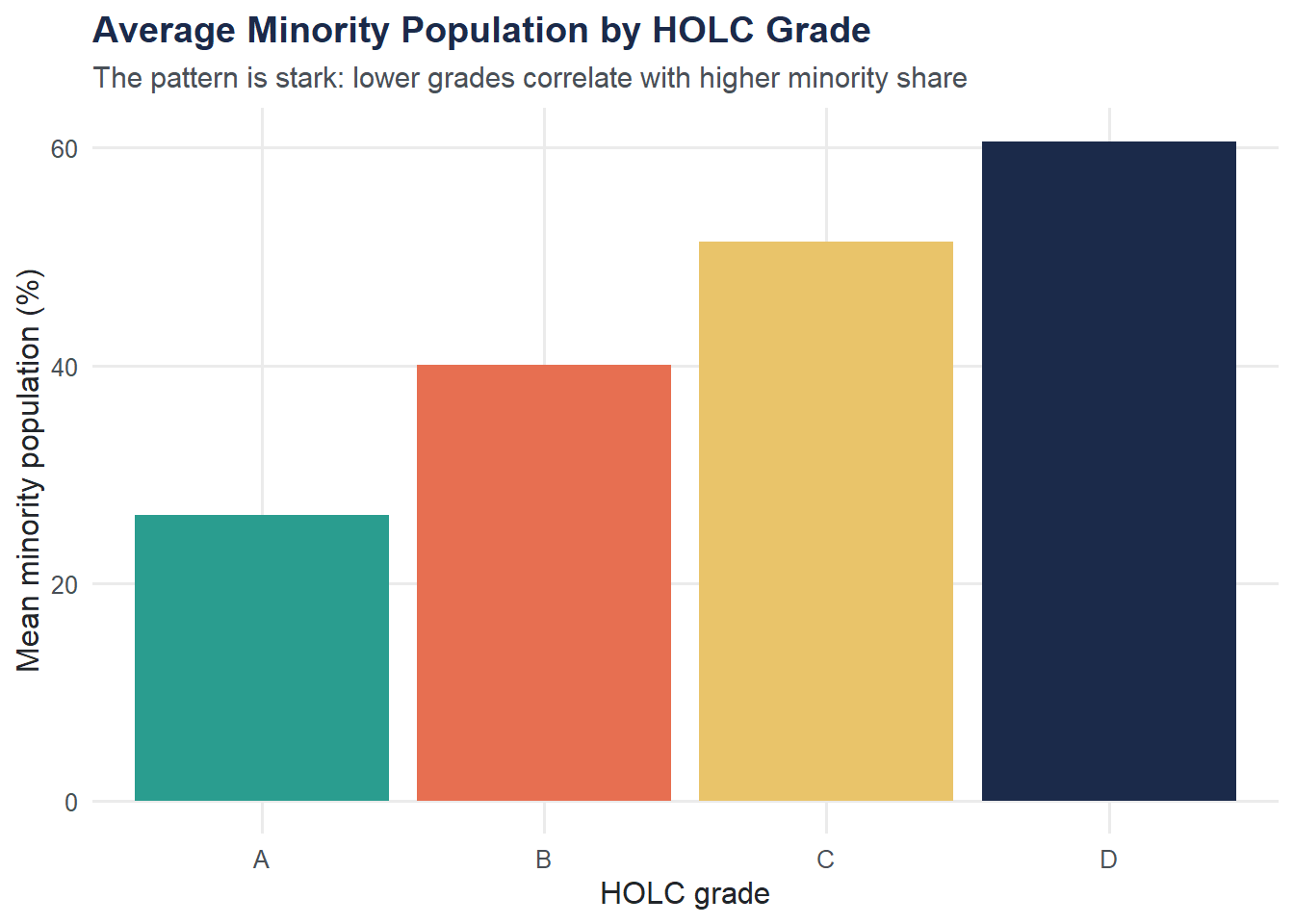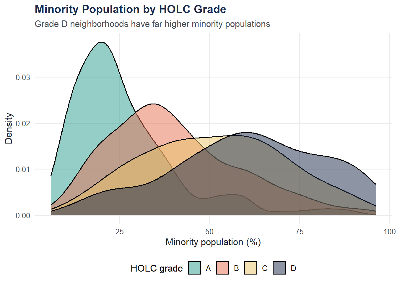 HOLC grades run from A (the “best” neighborhoods, which received the most investment) to D (the “hazardous” neighborhoods, which were systematically denied lending). Let’s make sure the grade variable is ordered correctly for all our plots.