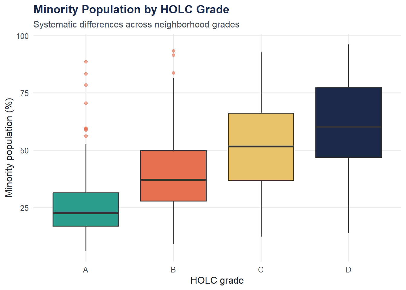 subtitle = "Grade D neighborhoods have far higher minority populations",