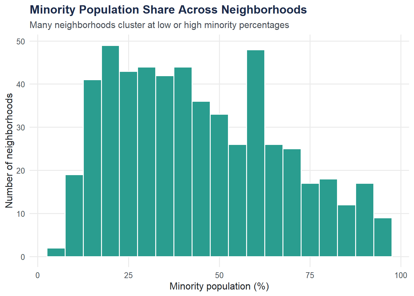 subtitle = "Many neighborhoods cluster at low or high minority percentages",