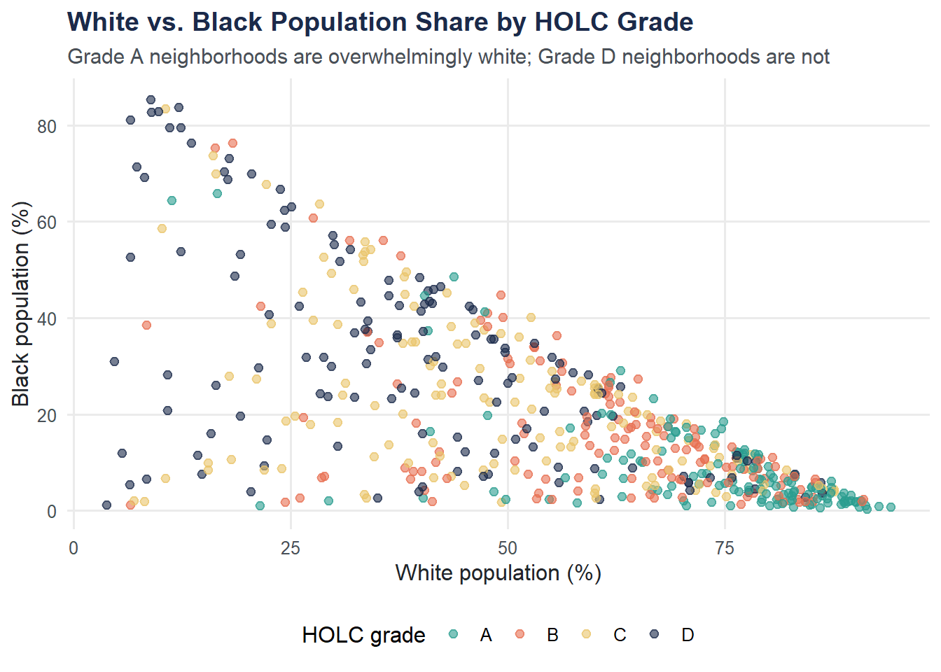 The right chart reveals what tables hide. In this walkthrough, we visualize the lasting effects of 1930s redlining on neighborhood demographics. The Home Owners’ Loan Corporation (HOLC) graded neighborhoods from A (“Best”) to D (“Hazardous”), and those grades shaped investment, housing, and racial composition for decades. We use histograms, density plots, boxplots, bar charts, and scatter plots to tell that story. This walkthrough accompanies Chapter 4 of Margin of Error.