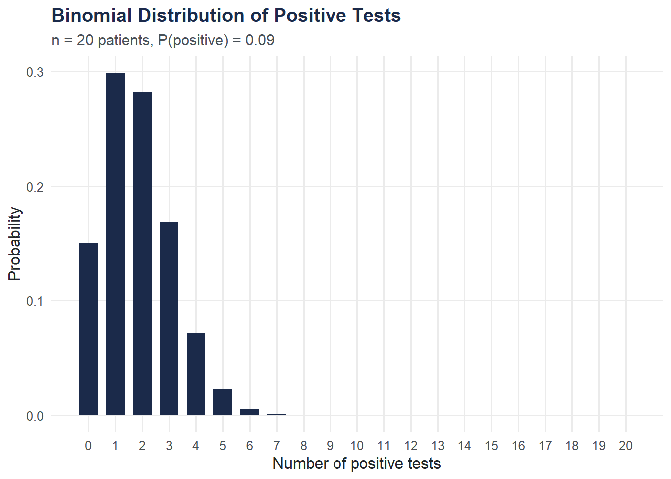 If we test 20 patients and each has a fixed probability of testing positive, the number of positives follows a binomial distribution. We use dbinom() to compute and plot the exact probabilities.