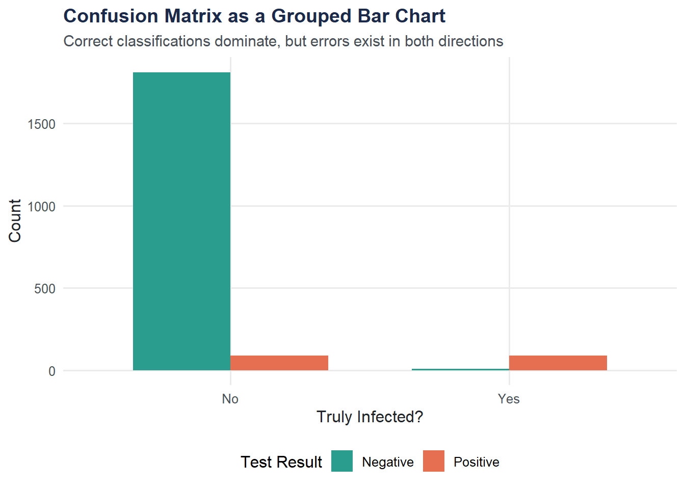 A grouped bar chart makes the confusion matrix easy to read at a glance: how do test results break down by true infection status?