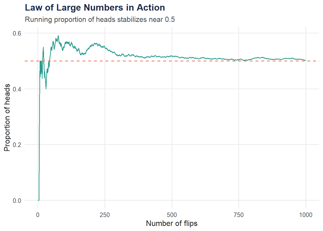 n_flips <- 10000and plot the running proportion. How quickly does it stabilize compared to 1,000 flips?
