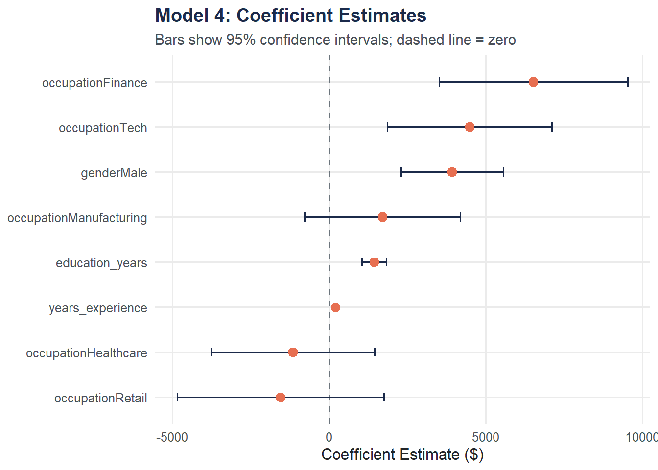 Notice how R handles occupation — a categorical variable — by creating dummy (indicator) variables automatically. Each occupation level gets its own coefficient, interpreted relative to the reference category (the first level alphabetically, unless you reorder the factor).