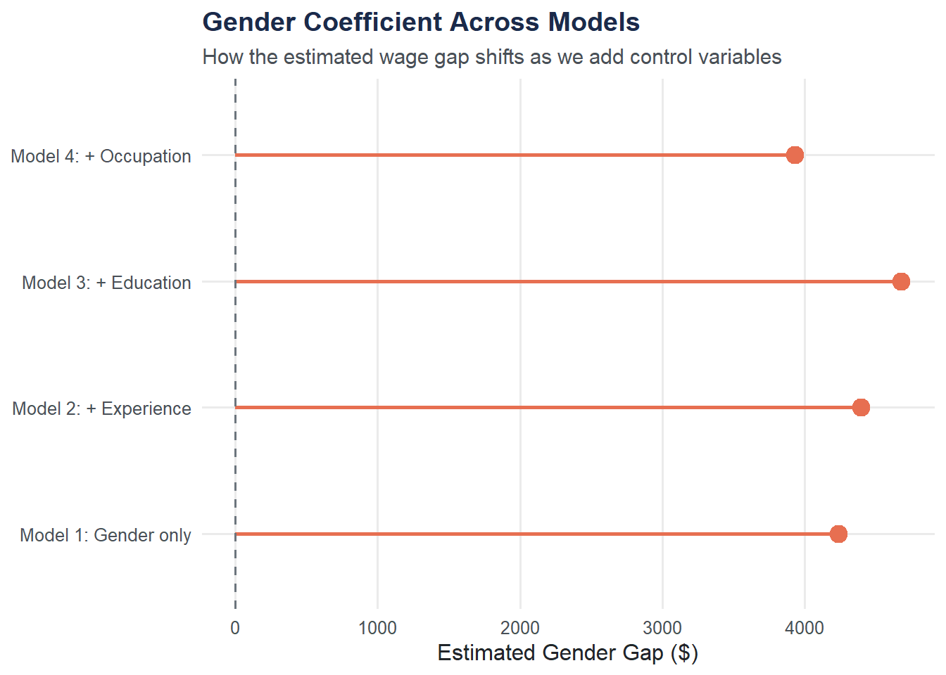 subtitle = "How the estimated wage gap shifts as we add control variables",
